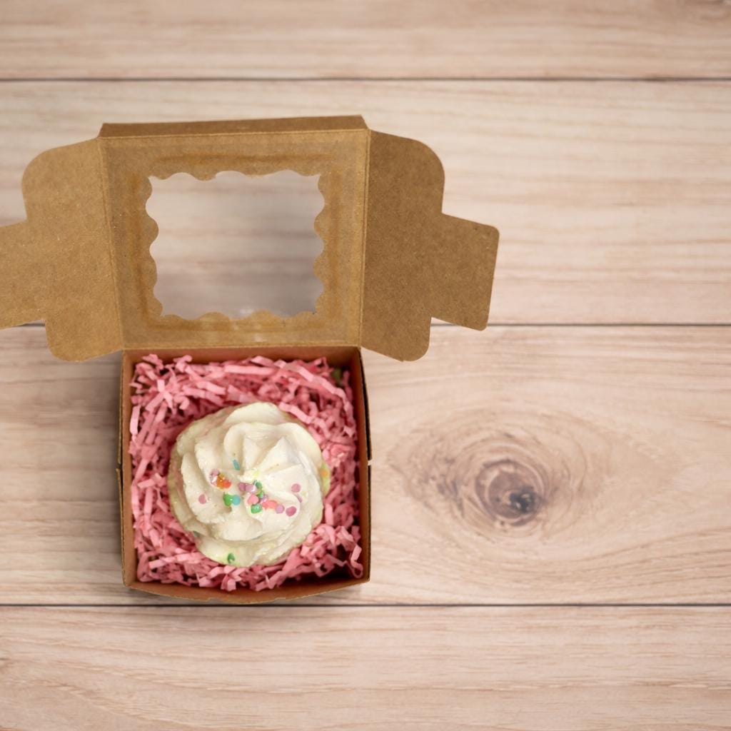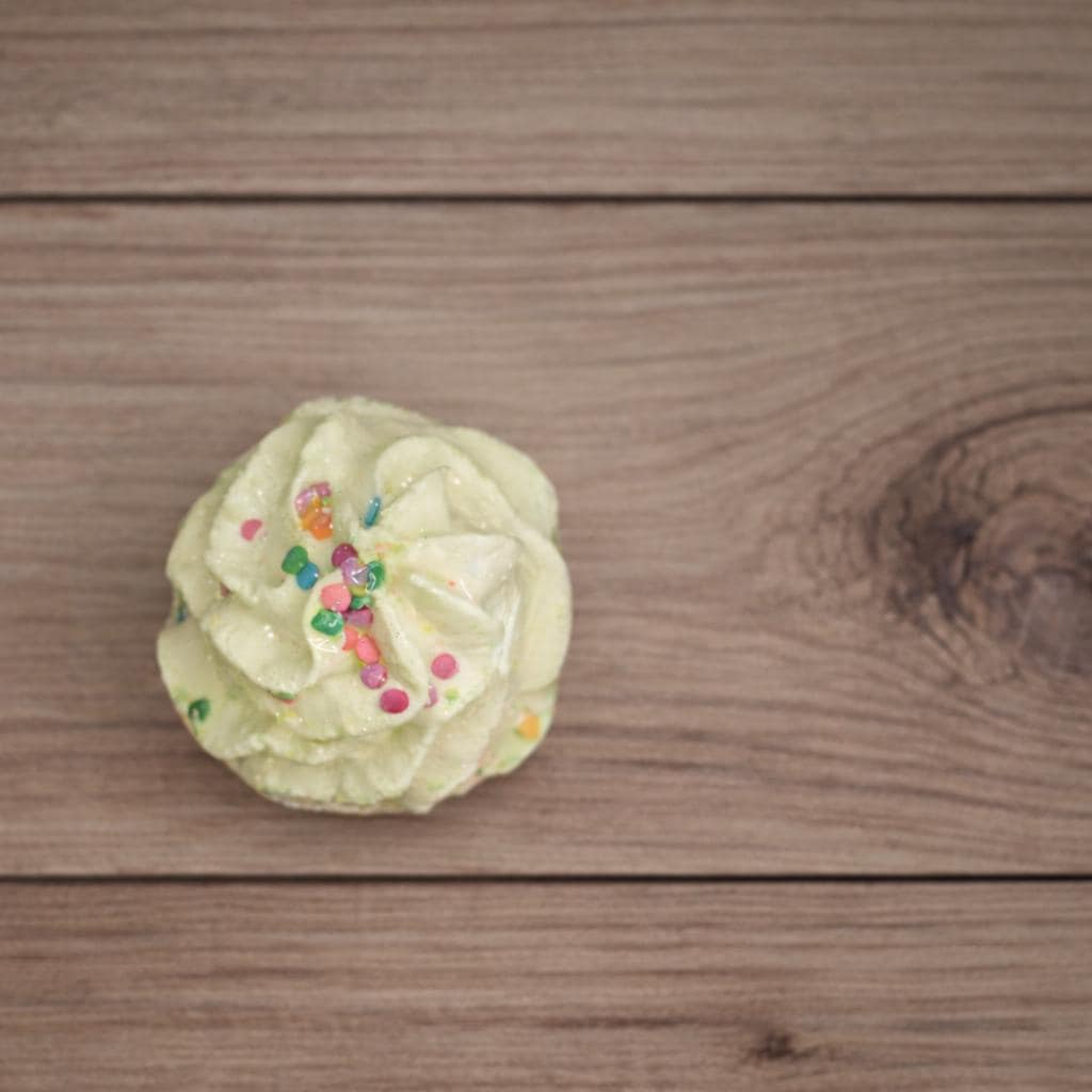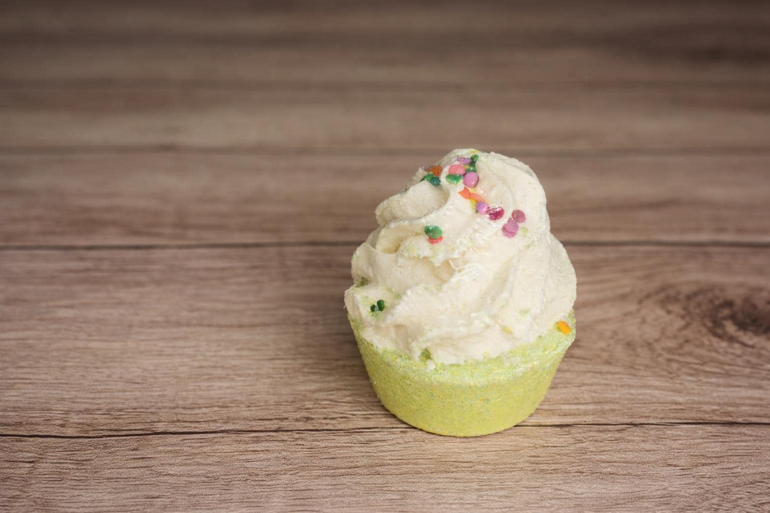 Birthday cupcake bath bomb with bath truffle on top. Lovely lemon, butter, vanilla and sugar scent.